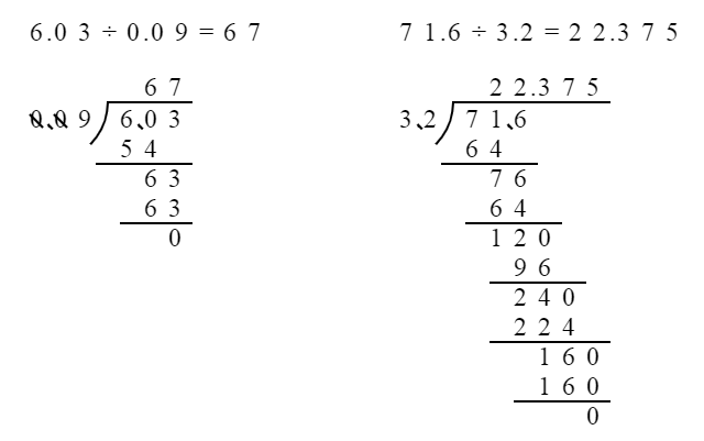 $6.03÷0.09 =$ $71.6÷3.2 =$
