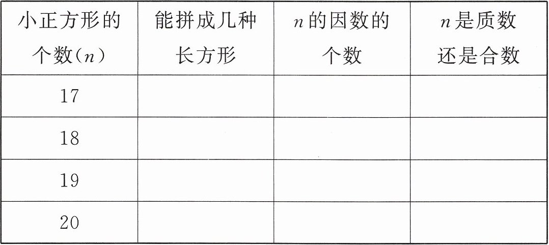 一、用17、18、19、20个小正方形分别可以拼成几种长方形?完成下表。