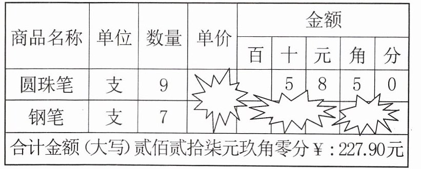 五、【思维拓展】购物发票不小心被弄脏了,请你算出圆珠笔和钢笔的单价。
