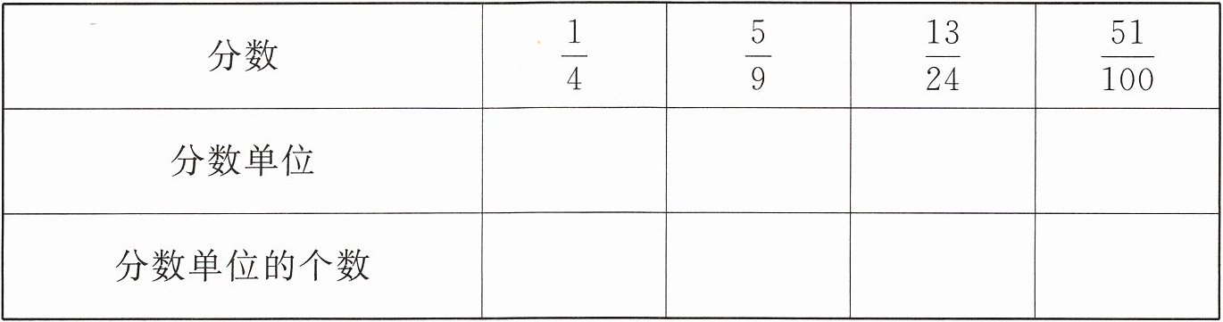 三、写出每一个分数的分数单位及每一个分数有几个这样的分数单位。