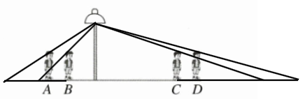 九、小乐在路灯下行走,画出他在 A、B、C、D 各点时的影子,并回答问题。(8 分)