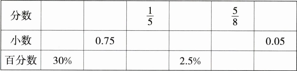 $\frac{3}{10}$ $\frac{3}{4}$ $\frac{1}{40}$ $\frac{1}{20}$ 0.3 0.2 0.025 0.625 75% 20% 62.5% 5%