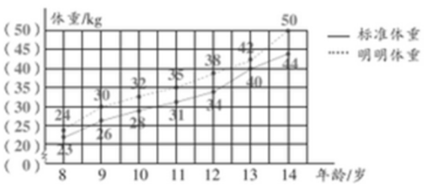 五、下表记录了明明8~14岁的体重以及同龄男生的标准体重。(16分)