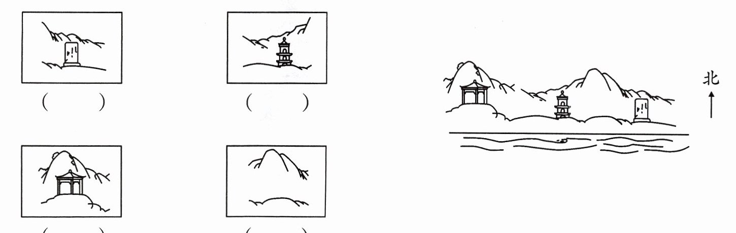 四、【思维拓展】小辰坐船沿着下右图中的小河自西向东游览时,正对着河岸连续拍摄了四张照片。在这四张照片下面的( )里用①②③④标出小辰拍摄的顺序。