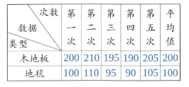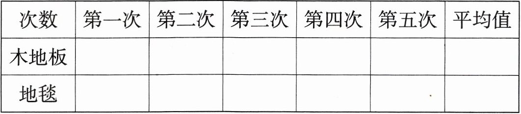 让两个完全一样且打足气的足球从 $3\,m$ 的高处自由落下,不同的是一个足球落在木地板上,另一个足球落在厚 $1\,cm$ 的地毯上。经过 $5$ 次实验,将得到的反弹高度的数据填入下表。(单位:$cm$)