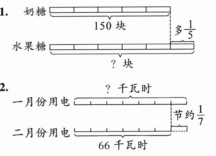 1.$150 × (1 + \frac{1}{5}) = 180$(块)2.$66 ÷ (1 - \frac{1}{7}) = 77$(千瓦时)