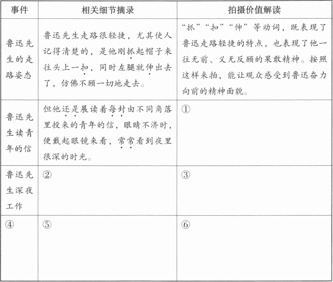 | 鲁迅先生的走路姿态 | 鲁迅先生走路很轻捷,尤其使人记得清楚的,是他刚抓起帽子来往头上一扣,同时左腿就伸出去了,仿佛不顾一切地走去。 | “抓”“扣”“伸”等动词,既表现了鲁迅走路轻捷的特点,也表现了他一往无前、义无反顾的果敢精神。按照这样来拍,能让观众感受到鲁迅奋力向前的精神面貌。 |