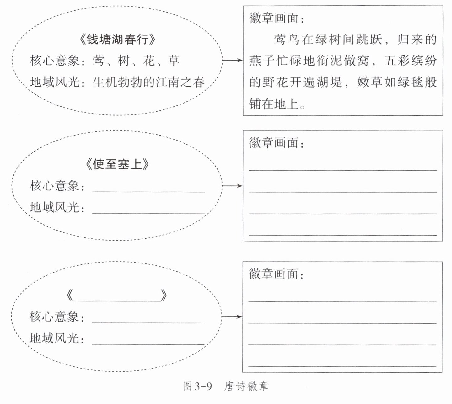 导学一 《唐诗五首》描写的山水风光带有鲜明的地域特色。朗读诗歌,抓取核心意象,描述徽章画面。