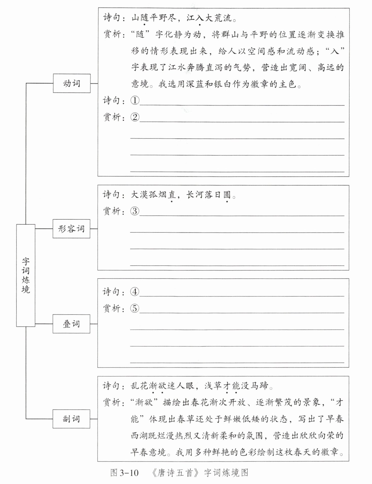 [示例]①几处早莺争暖树 ②"争"字描绘出早莺在枝头你追我赶、竞相抢占暖树的热闹场景,展现出鸟儿们欢快活泼的状态,营造出充满生机活力、清新自然的春日意境,让人感受到春天的气息和涌动的生命力量。我用绿色为徽章着色。 ③"直"强调了孤烟的独立和挺拔,突出了大漠的空旷寂寥;"圆"则赋予落日一种饱满、柔和的美感,与长河的蜿蜒流淌形成对比,一刚一柔,一竖一横,使整个画面更具层次感和立体感,营造出一种雄浑壮阔的意境,让读者感受到塞外风光的壮美与苍凉。我用红、黄两色为徽章着色。 ④晴川历历汉阳树,芳草萋萋鹦鹉洲。 ⑤"历历"形容汉阳树清晰可数,展现了阳光下汉阳平原上树木错落有致的景象;"萋萋"描绘出鹦鹉洲上芳草繁茂的样子,展现出一幅生机勃勃、绿意盎然的画面,给人以强烈的视觉冲击,营造出悠远、绵长的意境。我用烟青色为徽章着色。