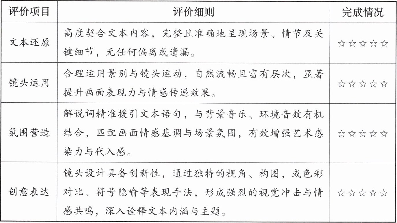 |创意表达|镜头设计具备创新性,通过独特的视角、构图,或色彩对比、符号隐喻等表现手法,形成强烈的视觉冲击与情感共鸣,深入诠释文本内涵与主题。|☆☆☆☆☆|