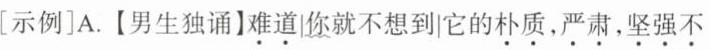 |朗读设计|【女生独诵】难·道你就觉得它只·是树——?(眼神坚定)④A. 【 】难道你就不想到它的朴质,严肃,坚强不屈,至少也象征了北方的农民?( )B. 【 】难道你竟一点也不联想到,在敌后的广大土地上,到处有坚强不屈,就像这白杨树一样傲然挺立的守卫他们家乡的哨兵?( )C. 【 】难道你又不更远一点想到,这样枝枝叶叶靠紧团结,力求上进的白杨树,宛然象征了今天在华北平原纵横决荡,用血写出新中国历史的那种精神和意志?( )朗读标记:“|”表停顿,“⌒”表连接,“﹏﹏”表轻音,“·”表重音,“——”表尾音延长,“⊙”表语速快,“△”表语速慢,“<”表语气由弱到强,“>”表语气由强到弱。| [提示]“【 】”内写“男生/女生/全体、独诵/合诵”,“( )”内写眼神或肢体动作。选择一处说明你的设计理由:⑤______。|