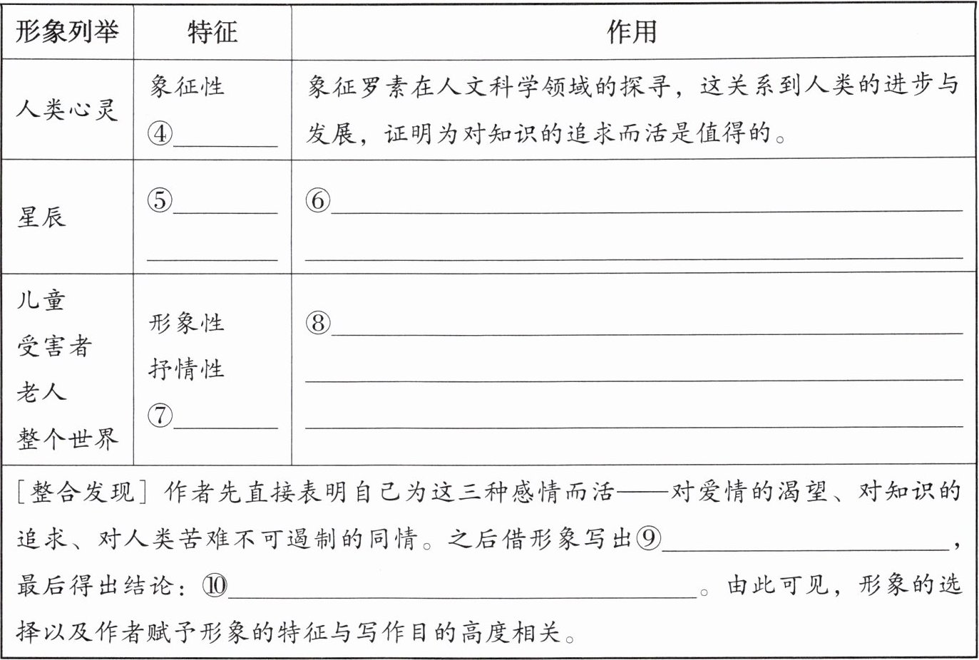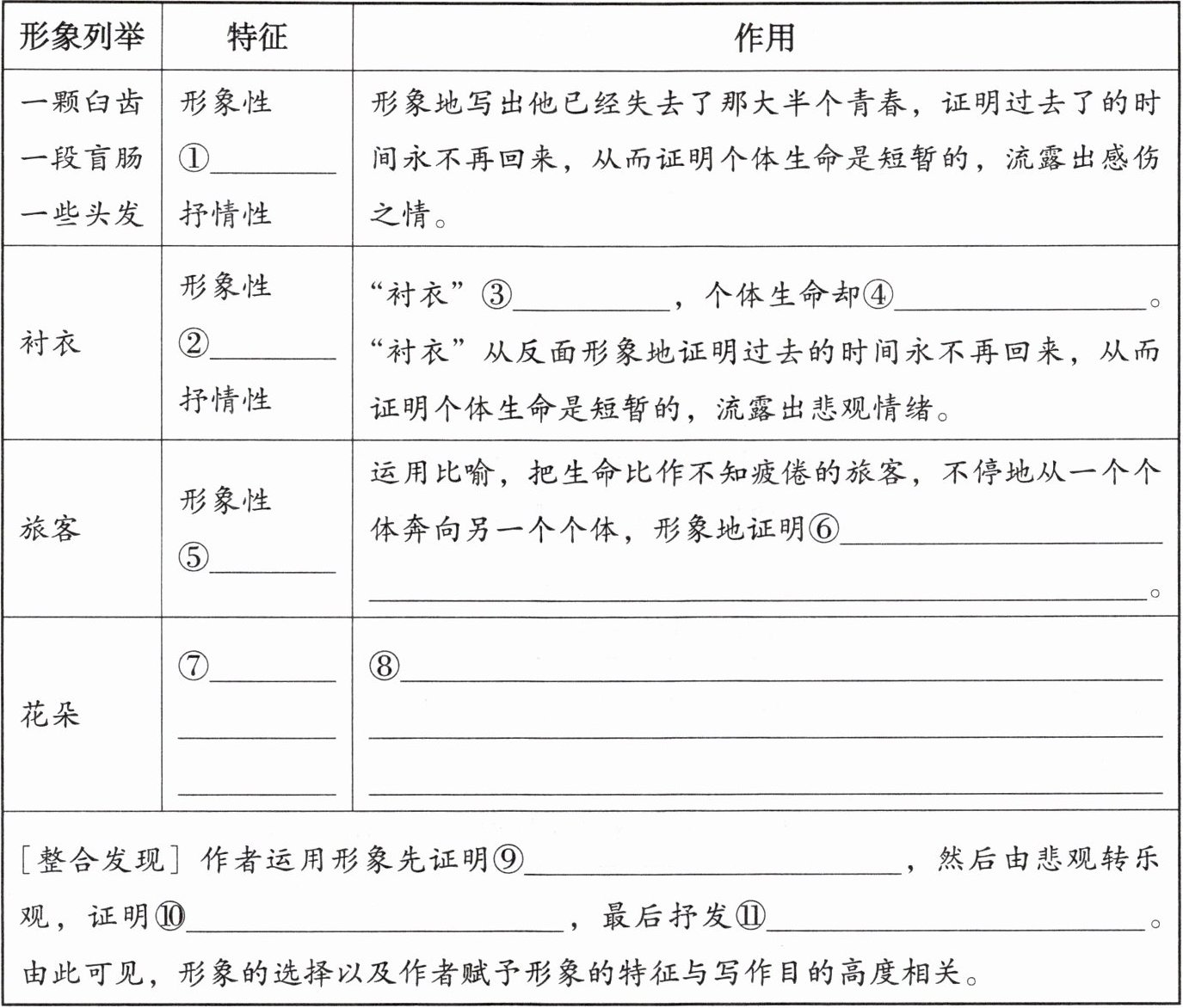 《永久的生命》①哲理性 ②哲理性 ③可洗可补 ④无法取消印迹 ⑤哲理性 ⑥虽然个体生命是短暂的,但是整体生命却是永久的 ⑦形象性 哲理性 抒情性 ⑧运用比喻的修辞手法,把生命比作花朵,“永存”“不断”表明一朵花会凋谢,但此花开败彼花便会绽放,形象地证明整体生命是永久的。作者又以花朵的“色彩”和“芳香”体现整体生命的美好,抒发作者对永久的生命的赞美之情 ⑨个体生命是短暂的 ⑩整体生命是永久的 ⑪对永久的生命的赞美之情 《我为什么而活着》①哲理性 ②哲理性 ③“圣贤和诗人们所想象的仙境”是圣洁而浪漫的,能带来狂喜、欢愉,形象地写出爱情的美好,表达作者对爱情的无比憧憬之情,也证明为寻求爱情而活是值得的。 ④哲理性 ⑤象征性 哲理性 ⑥希望知道星辰为什么闪闪发光,象征作者对自然科学领域的探寻,这关系到人类的进步与发展,证明为对知识的追求而活是值得的。 ⑦哲理性 ⑧这是作者对人类苦难的形象化表达,饱含着作者的同情,且这种大我意识有力地证明了为对人类苦难不可遏制的同情而活是值得的。 ⑨为他们而活的原因 ⑩我为这三种感情而活是值得的