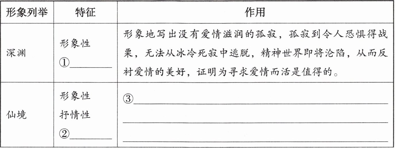 |形象地写出没有爱情滋润的孤寂,孤寂到令人恐惧得战栗,无法从冰冷死寂中逃脱,精神世界即将沦陷,从而反衬爱情的美好,证明为寻求爱情而活是值得的。||仙境|形象性抒情性②