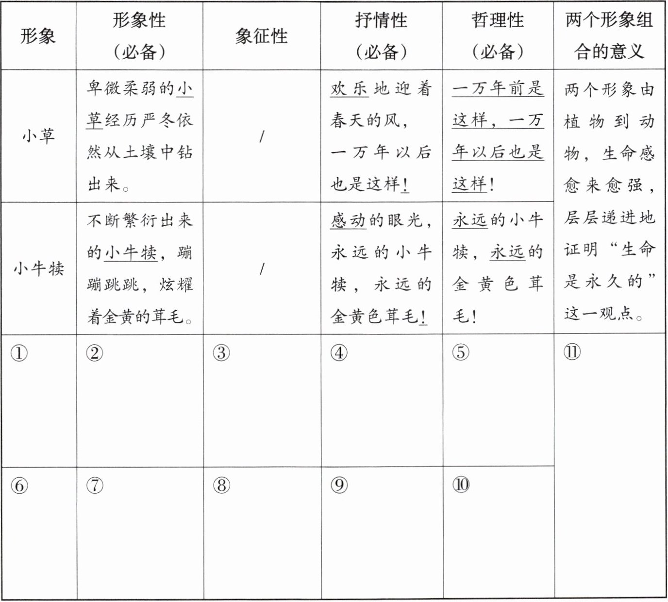 |⑪两个形象都富有生命力,在强调生命因繁衍而永久的同时,其顽强、执着等象征意义也强调了个体生命本身的永恒价值,而且从植物到动物,生命感更强,层层递进地证明生命是永久的这一观点。