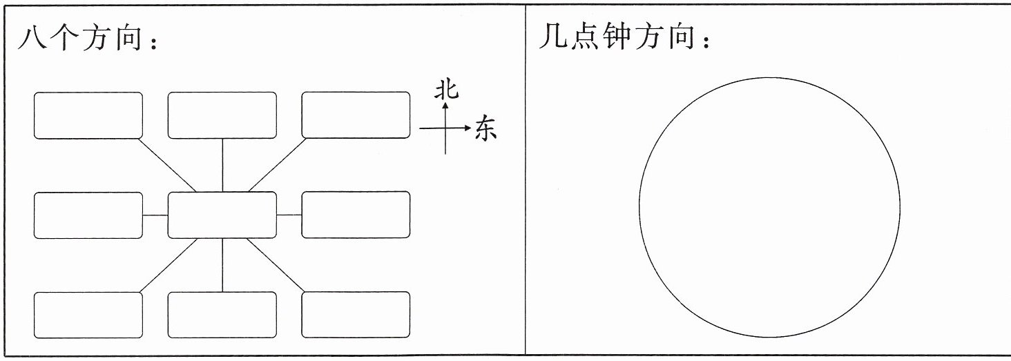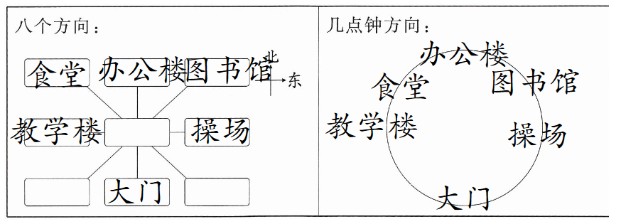 )点钟方向。活动二 创意绘图,请在下图中用两种方法绘制校园简易地图,并向同桌介绍你所绘制的建筑物的位置。