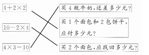 二、根据条件“小军用10元买早餐”,结合食品价格想想每个算式的意思,连一连。