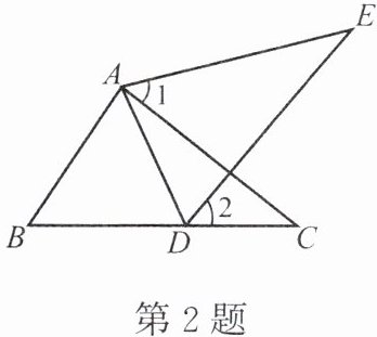 2. 如图,点 D 在 BC 上,∠1 = ∠2,AE = AC。给出下面三个条件:①AB = AD,②BC = DE,③∠E = ∠C。请你从所给的条件中选一个条件,使△ABC≌△ADE,并给予证明。