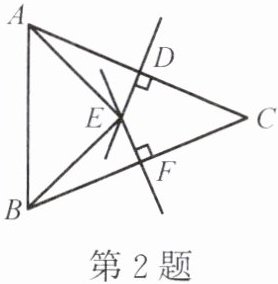 2. 如图,在 $ \triangle ABC $ 中,$ AC = BC $,$ DE $ 是边 $ AC $ 的垂直平分线,$ FE $ 是边 $ BC $ 的垂直平分线,连结 $ AE $,$ BE $。求证:$ \angle CAE = \angle CBE $。