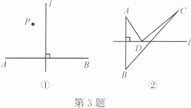 (1) 如图①,直线 $ l $ 是线段 $ AB $ 的垂直平分线,点 $ P $ 在直线 $ l $ 的左侧,经测量 $ PA < PB $,请证明这个结论。