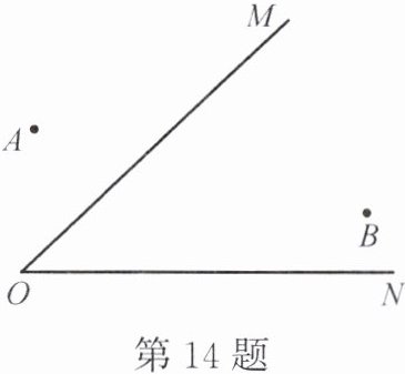 14. 某景区拟在两条景观道$OM$,$ON$之间(即$\angle MON$内部)修建一所红十字救助站$P$,使其到景观道$OM$,$ON$的距离相等,同时到$A$,$B$两个休息亭的距离也相等,试用直尺和圆规作出救助站$P$的位置。