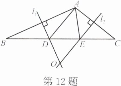 12. 如图,在$\triangle ABC$中,边$AB的垂直平分线l_1交BC于点D$,边$AC的垂直平分线l_2交BC于点E$,$l_1与l_2相交于点O$。$\triangle ADE的周长为8$,分别连结$OA$,$OB$,$OC$。若$\triangle OBC的周长为18$,则$OA = $