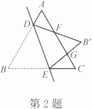 2. 如图,在等边三角形 $ ABC $ 中,点 $ D $,$ E $ 分别在边 $ AB $,$ BC $ 上,把 $ \triangle BDE $ 沿直线 $ DE $ 翻折,使点 $ B $ 落在点 $ B' $ 处,$ DB' $,$ EB' $ 分别交边 $ AC $ 于点 $ F $,$ G $。若 $ \angle ADF = 80° $,则 $ \angle EGC = $