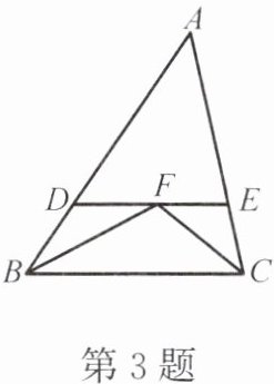 3. 如图,在 $ \triangle ABC $ 中,$ BF $,$ CF $ 都是角平分线,过点 $ F $ 作 $ DE // BC $,交 $ AB $ 于点 $ D $,交 $ AC $ 于点 $ E $。给出下列结论:①$ \triangle BDF $,$ \triangle BCF $,$ \triangle CEF $ 都是等腰三角形;②$ \triangle ADE $ 的周长等于 $ AB + AC $;③$ 2\angle BFC - \angle A = 180° $。其中正确的结论是