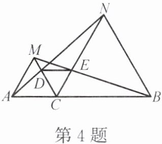 4. 如图,$ C $ 为线段 $ AB $ 上的一点,$ \triangle ACM $,$ \triangle CBN $ 都是等边三角形,连结 $ AN $ 和 $ BM $,分别交 $ MC $,$ NC $ 于点 $ D $,$ E $,连结 $ DE $。求证: