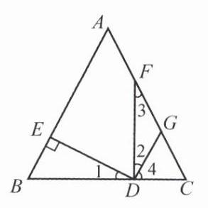 因为DE⊥AB,FD⊥BC,所以∠BED=∠FDC=90°。