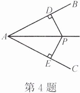 4. 如图,点 $ P $ 在 $ \angle BAC $ 的内部,$ PD \perp AB $ 于点 $ D $,$ PE \perp AC $ 于点 $ E $。