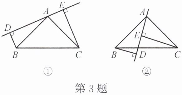 3. 如图,在 $ \triangle ABC $ 中,$ AB = AC $,$ DE $ 是过点 $ A $ 的直线,$ BD \perp DE $ 于点 $ D $,$ CE \perp DE $ 于点 $ E $。