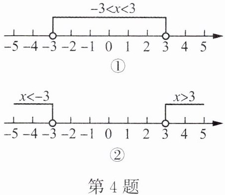 从图②所示的数轴上看:小于$-3或大于3的数的绝对值大于3$,即$\vert x\vert > 3$。
