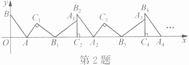 2. 如图,在平面直角坐标系中,将Rt△ABO绕点A顺时针旋转到△AB_1C_1的位置,点B,O分别落在点B_1,C_1处,点B_1在x轴上;将△AB_1C_1绕点B_1顺时针旋转到△A_1B_1C_2的位置,点C_2在x轴上;将△A_1B_1C_2绕点C_2顺时针旋转到△A_2B_2C_2的位置,点A_2在x轴上;依次进行下去……若点A($\frac{5}{3}$,0),B(0,4),则点B_1₀₀的坐标为____