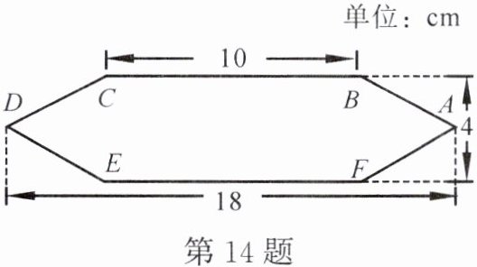 14. 如图,六边形$ABCDEF$是轴对称图形,且有两条对称轴,点$B的对称点既可以是点C$,也可以是点$F$。根据图中的数据,请你直接在图上建立一个平面直角坐标系,并写出点$A$,$B$,$C$,$D$,$E$,$F$的坐标。