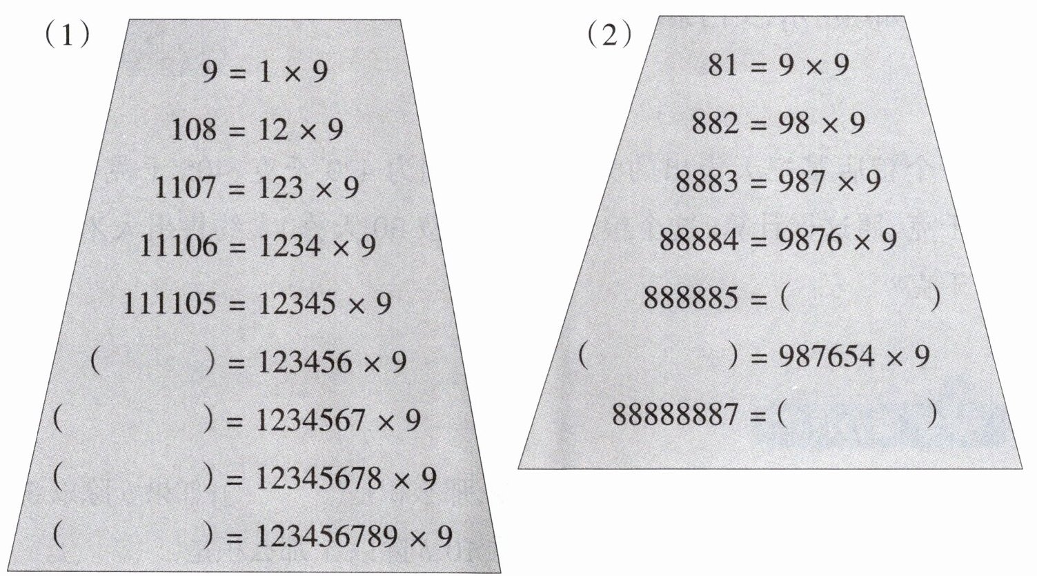 (2)观察右侧算式规律:乘数为9,98,987,...(依次减少1),结果中“8”的个数等于乘数位数,最后一位数为乘数位数。
