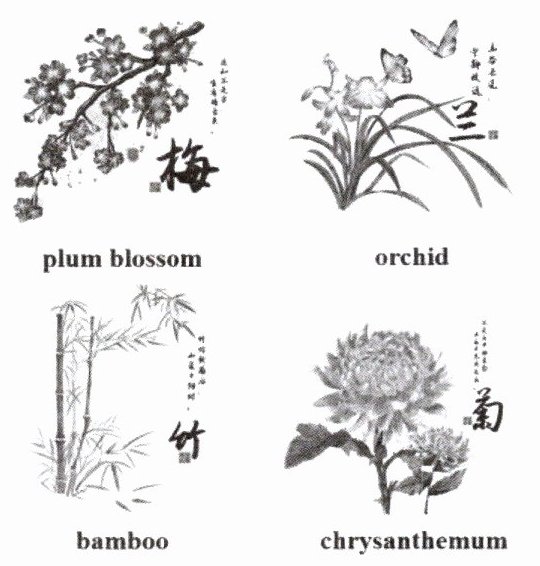 In the world of flowers, plum blossoms, orchids, bamboo and chrysanthemums are known as the four gentlemen (君子) in China. They are 1.