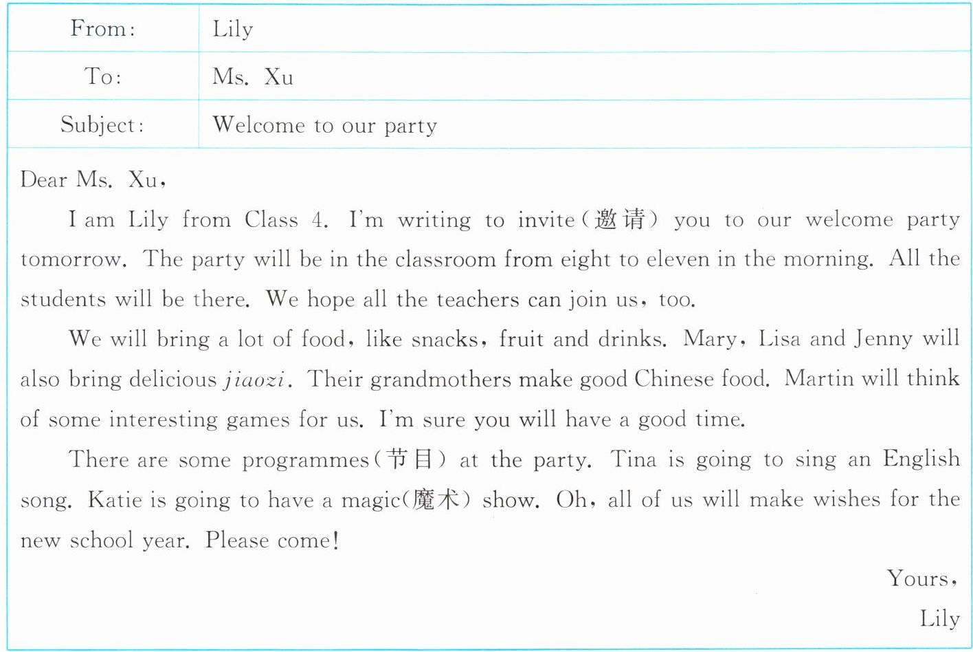 Ⅱ. Read the email and complete the invitation(邀请) card.