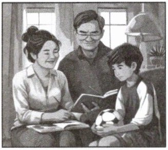 Look at this photo. There are three people in my family, my wife Bella, my son Terry and me. Bella is quiet. 3.