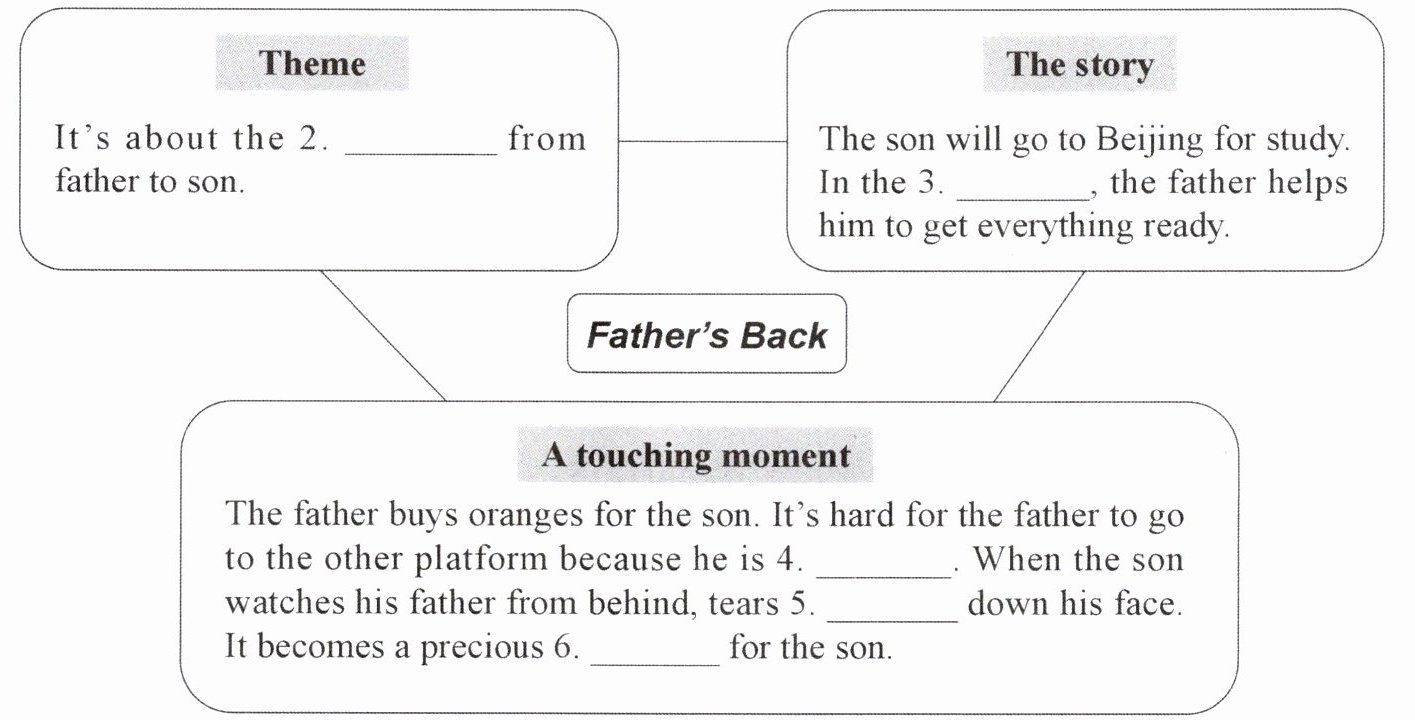 The moment at the station becomes a precious(珍贵的) memory for the son. Fathers get aged, but their love and care for the children will never change(改变).
