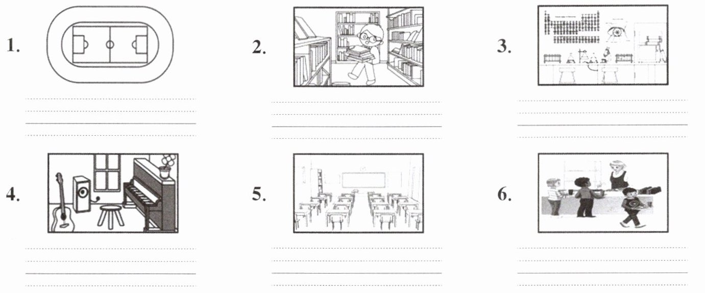Ⅰ. 1. playground 2. library 3. science lab 4. music room 5. classroom 6. dining hall