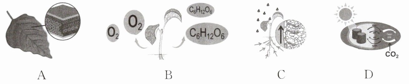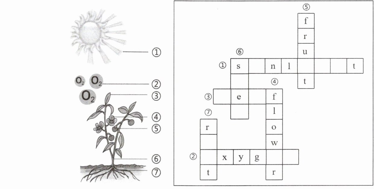 ①sunlight ②oxygen ③leaf ④flower ⑤fruit ⑥stem ⑦root