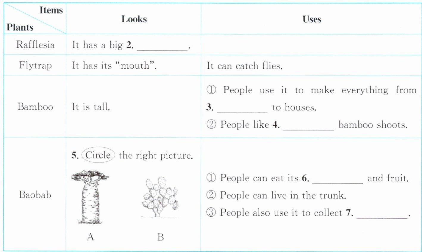 1. A 2. flower 3. chairs 4. eating 5. A 6. leaves 7. water 8. . One possible version: I know Dancing Plant. It can move all by itself.