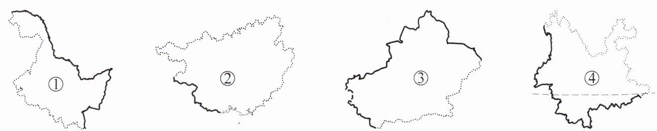 读我国四个省级行政区轮廓示意图,完成第1~2题。