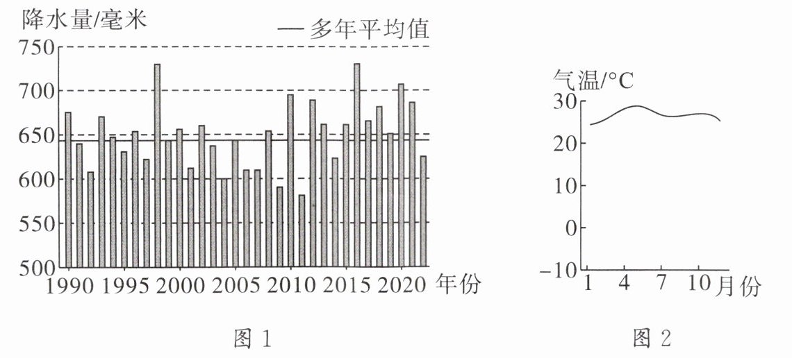 读我国年降水量变化图(图1)和某城市多年平均各月气温图(图2),完成6~7题。