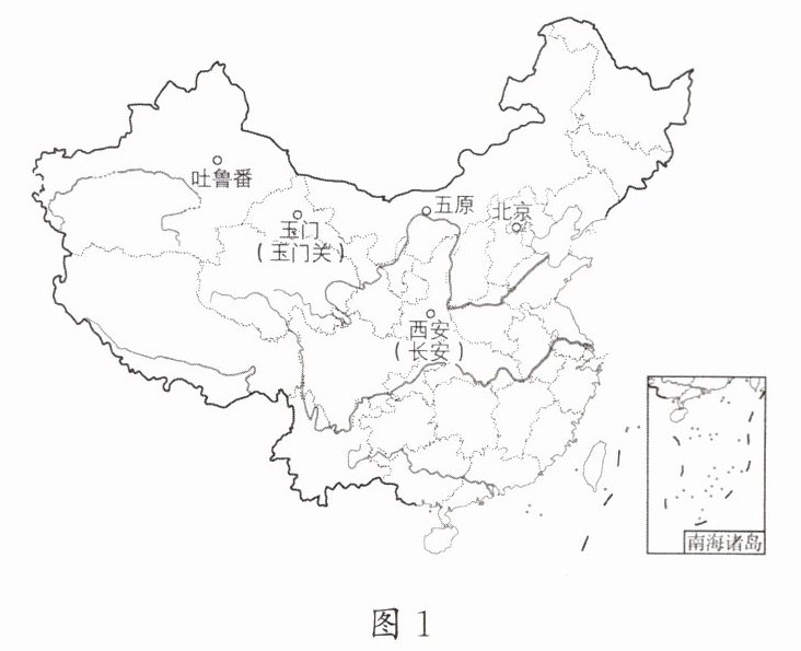【解析】第(1)题,“南国春意浓,北国正冰封”反映南方地区已经进入了春天,北方地区还在经历寒冬,说明我国冬季南北温差大。第(2)题,根据图1可知,五原的纬度比长安(现西安)高,所以五原的春天来得较长安迟,当五原河畔的冰开始融化时,长安的花已经开始凋谢了。这说明两地热量存在差异,反映了纬度位置对气候的影响。根据诗句可知,此时是农历二月,五原距离冬季风源地比较近,受冬季风的影响比较大。玉门关位于我国西北地区,“长风”主要指来自高纬度地区的西北风,“春风”指的是来自太平洋的东南风。“春风不度玉门关”主要是因为玉门关位于西北地区,深居内陆,距海遥远,海洋上的湿润气流难以到达,反映了海陆位置对气候的影响。第(3)题,根据所学知识可知,北京属于温带季风气候,夏季高温多雨,冬季寒冷干燥。第(4)题,根据所学知识并结合图2可知,吐鲁番位于我国西北地区,属于温带大陆性气候,受海陆位置影响,该地距海遥远,降水稀少,所以不需要带雨具。