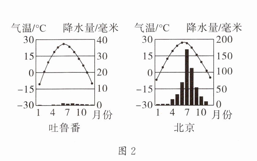 。(4)7月底,北京连降大雨,小辉从北京到吐鲁番参加研学旅行,妈妈提醒他别忘记带雨具。小辉需要带雨具吗?请结合图2与所学地理知识说明理由。