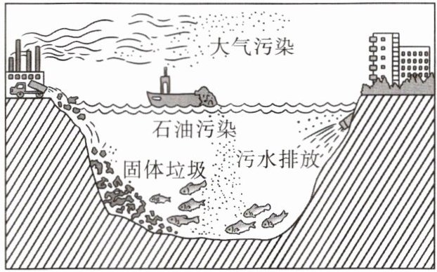 海洋是地球上生物多样性丰富的生态系统之一,它不仅是众多海洋生物的栖息家园,还承载着人类的航运、渔业、资源开发等活动。目前,海洋正遭受着工业废水、石油泄漏、海洋垃圾等各类污染的威胁,亟待全人类携手保护。读海洋污染示意图,完成下列各题。