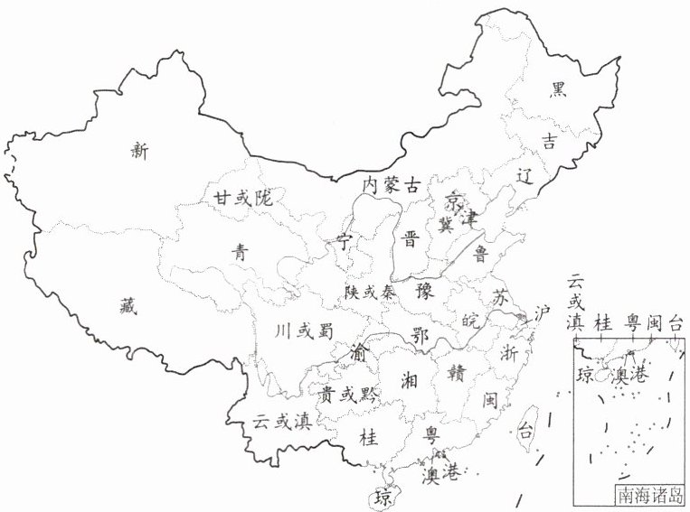 在生活中我们经常看到车牌号(粤A-×××××、鲁B-×××××)、特产包装(湘绣、晋醋)等。你知道这些简称是怎么来的吗?读我国省级行政区简称图,完成下列各题。