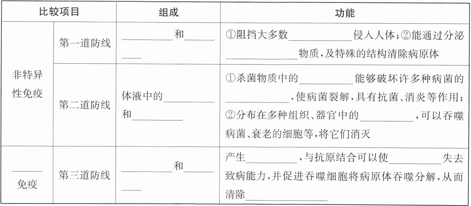 1.皮肤 黏膜 病原体 抑菌和杀菌 杀菌物质 吞噬细胞 溶菌酶 细胞壁 吞噬细胞 特异性 免疫器官 免疫细胞 抗体 病原体 病原体