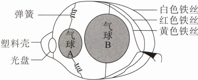 D 【解析】题图中的透明塑料壳模拟的是角膜,白色铁丝模拟的是巩膜。脉络膜含有丰富的血管和色素,给视网膜提供营养,并使眼内形成一个“暗室”,可见,题图中红色铁丝模拟的是脉络膜。光盘模拟的是虹膜(黑眼珠),能调节瞳孔的大小。气球A、B分别模拟的是有弹性的晶状体和玻璃体。